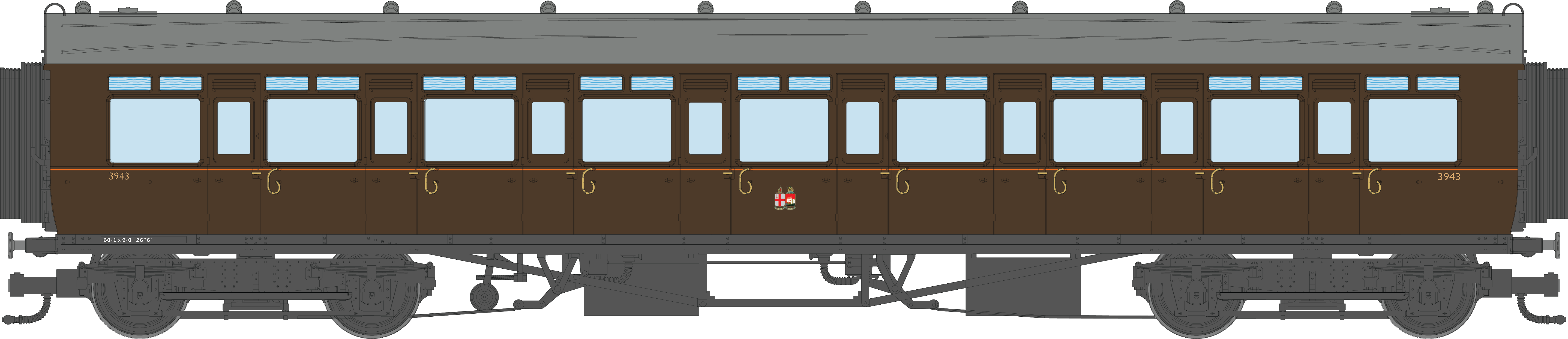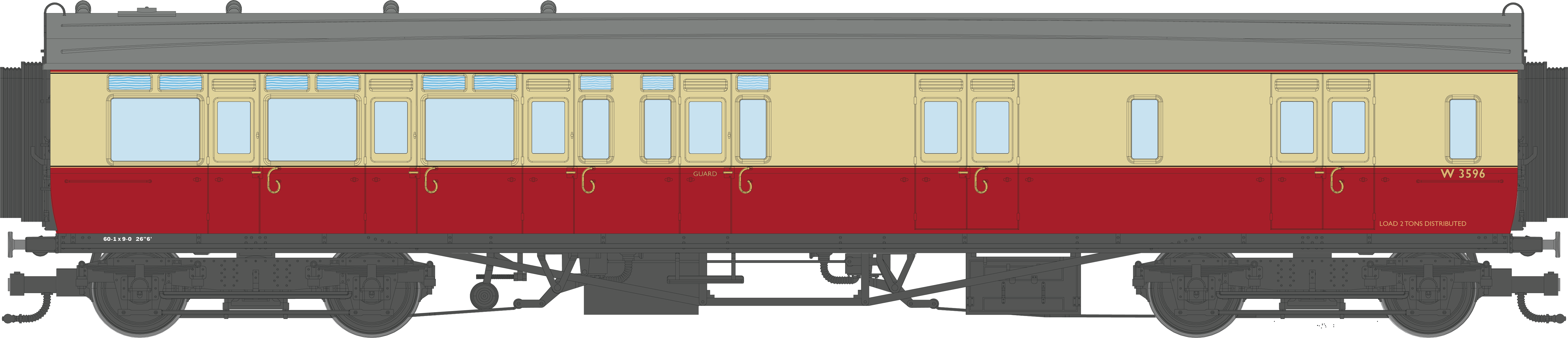 The prototype coaches were constructed between 1914 and 1920 made of steel body sides with an absence of panelling but with bolection mouldings around the windows and frosted glass top light windows, sitting on Churchward 9’-0” bogies. They were designed to operate as a set comprising Left hand and right-hand Brake Thirds, 1 or 2-Thirds and left hand and right-hand Composites enabling all corridor windows to be displayed on the same side, commonly used for cross country and main line working between cities.