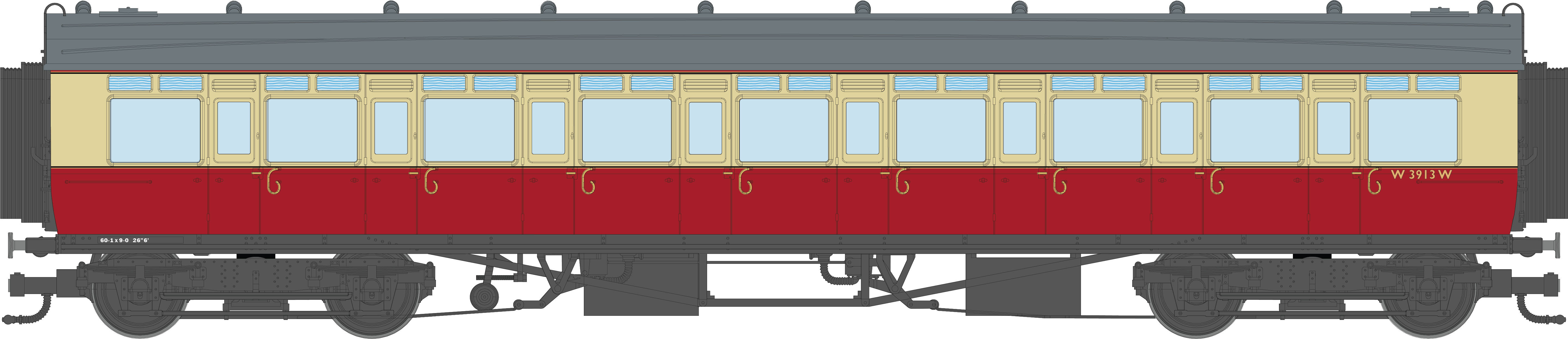 The prototype coaches were constructed between 1914 and 1920 made of steel body sides with an absence of panelling but with bolection mouldings around the windows and frosted glass top light windows, sitting on Churchward 9’-0” bogies. They were designed to operate as a set comprising Left hand and right-hand Brake Thirds, 1 or 2-Thirds and left hand and right-hand Composites enabling all corridor windows to be displayed on the same side, commonly used for cross country and main line working between cities.